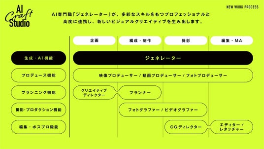 「AI Craft Studio」では、これまで博報堂プロダクツが培ってきた専門性と実施力にAIを掛け合わせることで、従来では実現できなかった新しいビジュアル表現やクリエイティブの用途を開拓いたします。長年ブランド領域を担ってきたクリエイティブディレクターやプランナーがAIを深く理解し、ストーリーやクラフト力で独自性を発揮するとともに、AIの専門性と従来の専門性を融合した新職種「ジェネレーター」を新設し、次世代のクリエイティブ体制を構築。