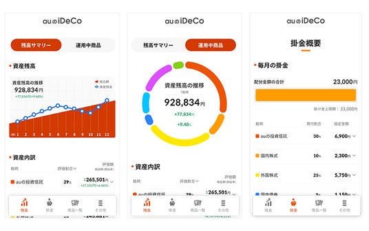 資産残高の推移・資産内訳毎の評価額/損益・掛金拠出額が確認可能