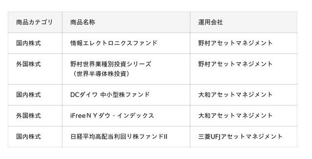 これまで提供してきた元本確保型の定期預金1商品や元本変動型の投資信託21商品に加え、お客さまの幅広い資産形成ニーズにお応えできるよう、運用コストを抑えたインデックスファンドや市場の収益を上回るリターンを目標とするアクティブファンドなど、計5商品の投資信託を追加します。