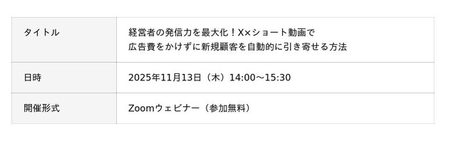 今回のセミナーでは、X(旧Twitter)発信とショート動画という2大手法を軸に、“広告に頼らない集客”を仕組み化する最新メソッドを90分で学べます。