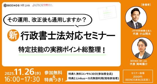 BEENOS株式会社の連結子会社で、特定技能雇用を包括支援するBEENOS HR Link株式会社(以下「BEENOS HR Link」)は、JAPAN行政書士法人と共同で2025年11月26日(水)、16:00~17:30に「その運用、改正後に通用しますか?特定技能の実務ポイント総整理!新・行政書士法対応セミナー」を開催します。
