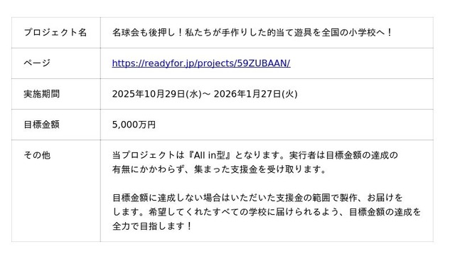 今回のクラウドファンディングではプロ野球のレジェンドたちが集まる『日本プロ野球名球会』にも応援をいただきながら、このプロジェクトを『全国』に範囲を広げることを目指し、その資金として5,000万円を目標金額に設定しております。多くの方からのご支援をお待ちしております。