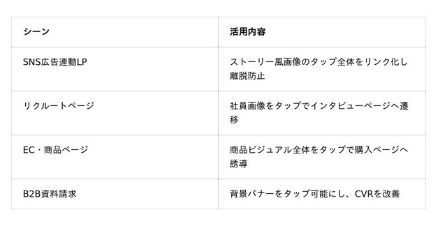 本機能により、ページ上の任意範囲をタップ可能エリアとして設定でき、スマートフォン閲覧時のUX向上とCVR(コンバージョン率)最適化に寄与します。