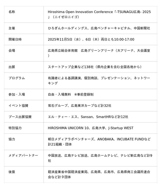 株式会社ひろぎんホールディングス(代表取締役社長 部谷 俊雄)、株式会社広島ベンチャーキャピタル(代表取締役社長 西岡 賢)および株式会社中国新聞社(代表取締役社長 岡畠 鉄也)は、広島県内企業と国内の有望なスタートアップをつなぎ、オープンイノベーション(事業共創)を促進させるマッチングイベント「-TSUNAGU広島-2025」を開催いたしますので、下記のとおりお知らせいたします。