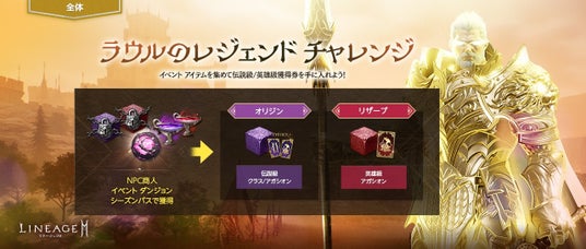 リザーブ ワールドでは、イベント「ラウルのヒーローチャレンジ」として、一部を除く各村に出現している専用のNPCから「封印された英雄のキューブ(イベント)」をアデナで交換し、シーズンパスや特定ダンジョンでのモンスター討伐により獲得できる「封印解除エッセンス(イベント)」を用いて、封印解除に挑戦できます。