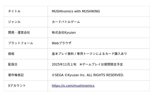 本ゲームは、MUSHIを使用した期間限定ゲームとして、リリース後、約6週間のイベント開催を予定しています。『甲虫王者ムシキング』のファンだけでなくWeb3ゲームのユーザーに楽しんでもらう事を目指しています。