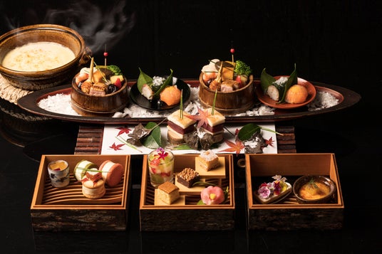 星のや軽井沢は浅間山麓の豊かな森に囲まれた、「谷の集落に滞在する」をコンセプトとした施設です。また、「日本らしさを大切にしながら近代化したとしたら」といった、空想の「もう一つの日本」を思い描き創られました。集落内にある棚田の風景もまた「もう一つの日本」をテーマに設計され、日本人の心に響く原風景として表現されています。その棚田を臨む休息の拠点として、2024年夏に棚田ラウンジが誕生しました。ラウンジ席に腰を降ろすと四季折々で異なる、季節の移ろいを楽しむことができます。森に囲まれた冬の軽井沢は、夏や秋とは違い、静けさに包まれた静謐な美しさが魅力です。この季節ならではの情景とともに、体が温まるアフタヌーンティーを楽しんで欲しいと考え、本食体験を開発しました。