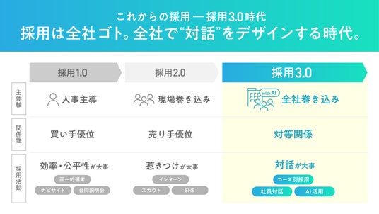 従来の採用活動は、スペックのマッチングを重視した人事主導のものでした。しかし、これからの採用は、全社で"対話”をデザインする時代へと移行しています。採用3.0時代では、人事部門だけでなく全社員がAIとともに採用活動に関わり、企業と求職者が対等な関係を築きます。