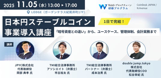 N.Avenue株式会社(東京都港区、代表取締役:神本侑季)は、「1日で完結!日本円ステーブルコイン事業導入講座 ~「暗号資産との違い」から、ユースケース、管理体制、会計実務まで~」を、2025年11月5日(水)13:00~17:00に現地開催いたします。本講座は、ステーブルコインの導入を検討する企業・団体向けに、法的根拠から実務までを1日で体系的に学べる実践型研修です。