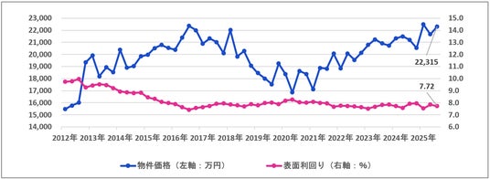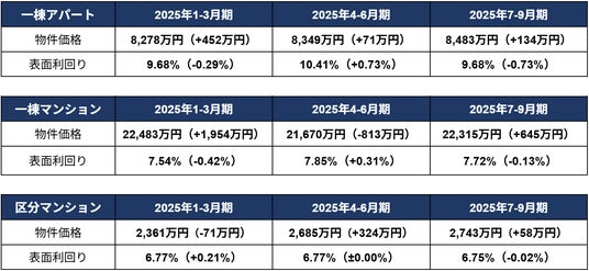 前四半期(2025年4-6月期)に続き、一棟アパート・区分マンションともに過去最高額を更新しました。一棟マンションにおいても、2025年1-3月期に記録した過去最高額2億2483万円に迫る、2億2315万円まで上昇しています。