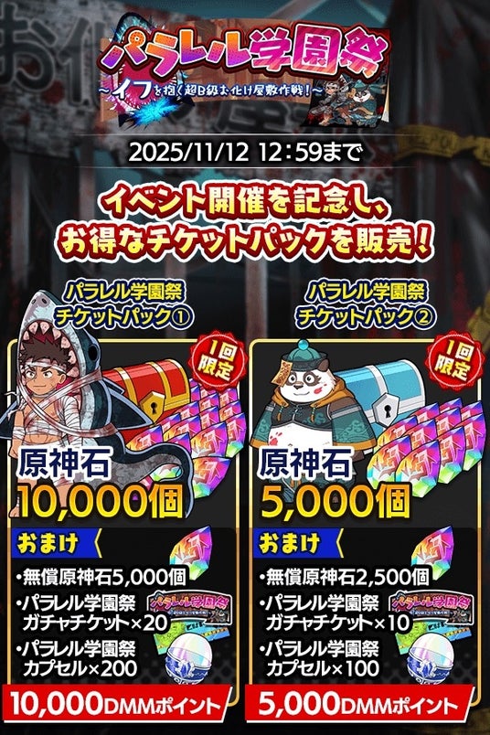 さらに、1回購入限定の「パラレル学園祭~イフを抱く超B級お化け屋敷作戦!~」チケットパックも2種期間限定で登場!おトク原神石が入手できる上にイベントガチャチケット、イベントカプセルの豪華おまけつきのパックをお見逃しなく!