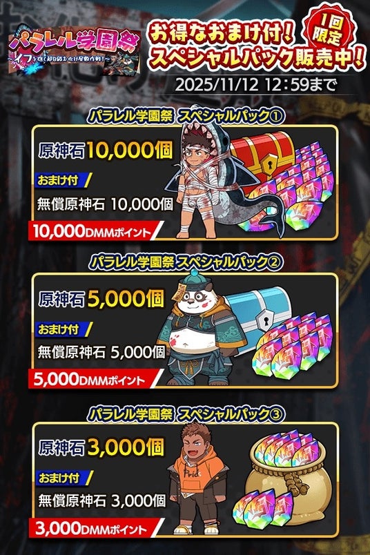 1回購入限定の「パラレル学園祭~イフを抱く超B級お化け屋敷作戦!~」スペシャルパックが3種期間限定で登場!おトクに原神石を購入できるチャンスですのでお見逃しなく。