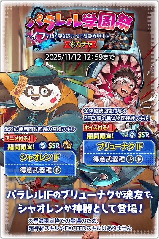 さらに、SSR魂友「ブリューナク IF」とSSR神器「シャオレン IF」が入手可能な期間限定の「パラレル学園祭~イフを抱く超B級お化け屋敷作戦!~」ガチャも登場!