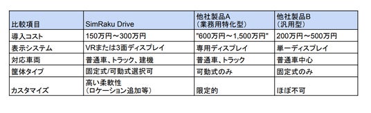 SimRaku Driveは、業務用に特化した他社製品と比較して、圧倒的なコストパフォーマンスと高いカスタマイズ性を誇ります。