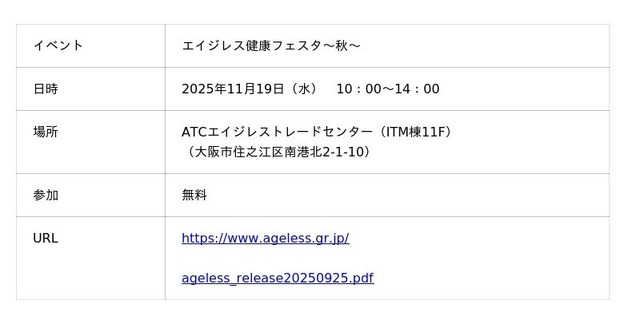 エイジレス健康フェスタは、世代や立場を問わず“楽しみながら健康になれる”ことをテーマとしたイベントです。日常生活に役立つ運動・健康機器のほか、地域交流を促す体験型コンテンツが多数集まり、気軽に参加できる健康づくりの場として毎年高い評価を受けています。