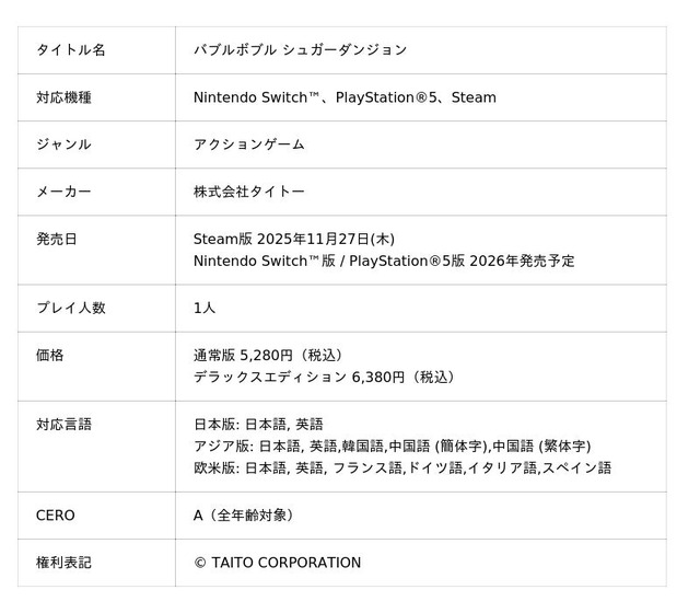 株式会社タイトー(本社:東京都新宿区、以下タイトー)は、アクションゲーム『バブルボブル シュガーダンジョン』Steam版の発売予定日である11月27日(木)に先立ち、本日より予約受付を開始しました。デジタルサウンドトラックやデジタルアートブックとセットになった、デラックスエディションの発売も決定し、こちらも本日より予約を開始します。