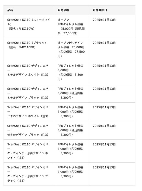 株式会社PFU(社長執行役員:平原 英治、以下 PFU)は、ワンタッチでスピーディーに書類を電子化するイメージスキャナー「ScanSnap」シリーズの新モデル「ScanSnap iX110」を、2025年11月13日より販売開始します。