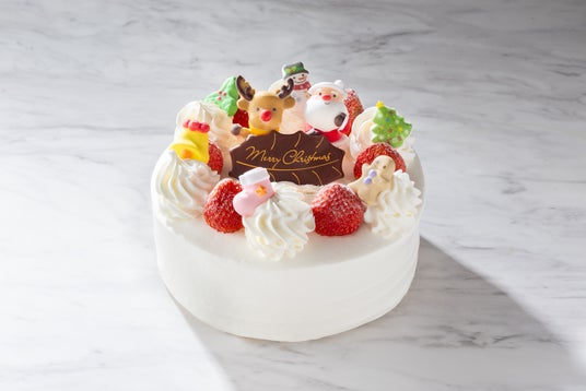 しっとりふわふわなスポンジにいちごとホイップクリームをたっぷりサンド!かわいいサンタやトナカイをのせた、楽しくにぎやかなクリスマスケーキです。