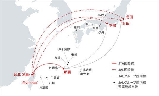 沖縄からほど近い台北は、伝統とモダンが融合した文化・グルメが豊富で、活気あふれる都市です。本路線の開設により、両地域の観光・経済交流をさらに活性化し、沖縄と台北を結ぶ新たな架け橋として、より便利で快適な空の旅を提供します。また那覇を玄関口として、JALグループの国内線や国際線ネットワークと組み合わせることで、周辺の離島をはじめとした日本各地への周遊や地方誘客にもつなげます。