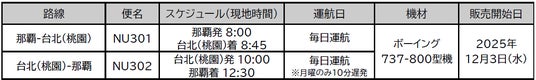 日本トランスオーシャン航空(本社:沖縄県那覇市、代表取締役社長:野口 望、以下「JTA」)は、初の国際線定期便となる那覇=台北(桃園)線の運航スケジュールを決定し、2026年2月3日(火)より毎日運航します。航空券の販売は2025年12月3日(水)10:00から開始します。
