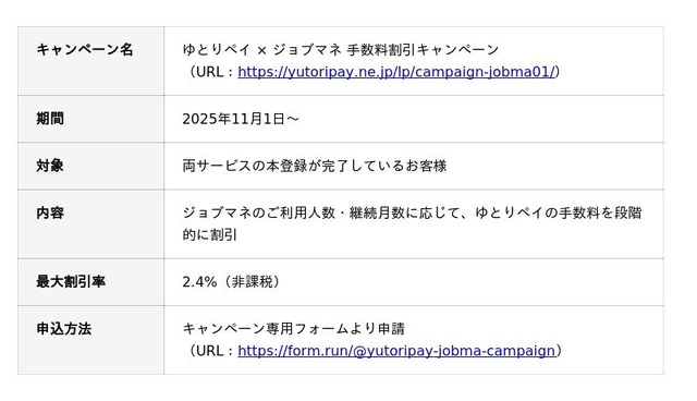 ジョブマネ株式会社(本社:沖縄県那覇市、以下「当社」)が提供する請求書カード払いサービスのゆとりペイは、当社が提供する業務管理ツール「ジョブマネ」と、コラボレーションキャンペーンとして、両サービスのユーザーを対象に、ゆとりペイの手数料を割引する「ゆとりペイ×ジョブマネ手数料割引キャンペーン」を開始します。