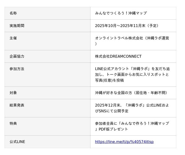 オンライントラベル株式会社(本社:大阪府大阪市)が運営する日本最大級の沖縄メディア「沖縄ラボ」は、株式会社DREAMCONNECT(本社:神奈川県横浜市)の企画協力のもと、LINE上でユーザー参加型キャンペーン「みんなでつくろう!沖縄マップ」を実施しています。