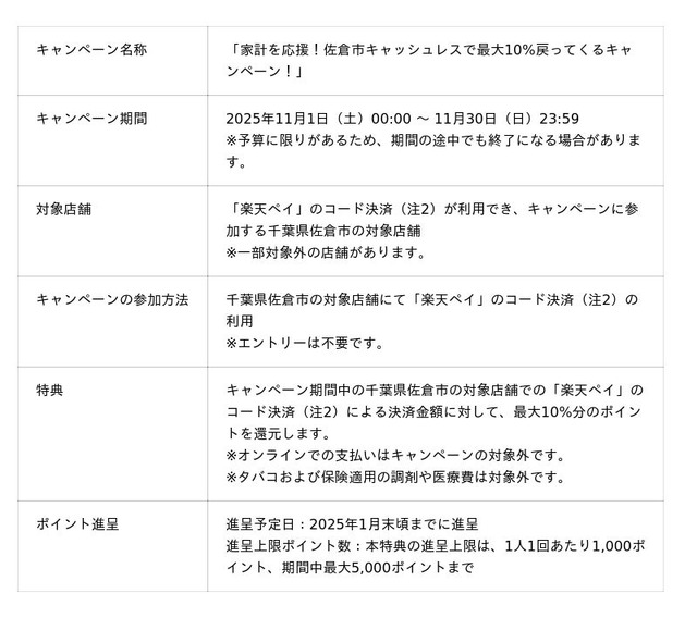 本キャンペーンでは、千葉県佐倉市の対象店舗(注1)において、キャンペーン期間中に「楽天ペイ」のコード決済(注2)を利用した方を対象に、決済金額に対して最大10%分の「楽天ポイント」を還元(注3)します。