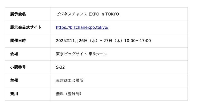 「ビジネスチャンス EXPO in TOKYO」とは、独自の技術や珍しい商材を持つ都内企業にくわえ、首都圏に販路拡大を目指す全国の企業が一堂に会し、その製品やサービスを来場者にPRすることで、新たな販路の開拓につなげることを目的としたBtoB向け総合展示会です。