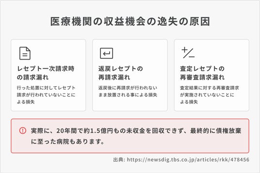 医事課職員の皆様が、日々の外来受付、電話対応、カルテ管理業務等の他、毎月数百~千件にも上るレセプトの作成・請求業務に従事される中、レセプトの返戻・査定未対応、算定漏れといった「目に見えないロス」を逐次拾い上げ、収益機会を最適化させるための施策を提言することは、業界構造的に非常に困難であると同時に、経営状況悪化の一因にもなっています。