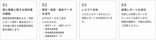 本キャンペーンで提供する「診断レポート」は、病院様のレセプトデータをもとに、レセプト業務全体を構成する要素を体系的に分析した結果をまとめたものです。