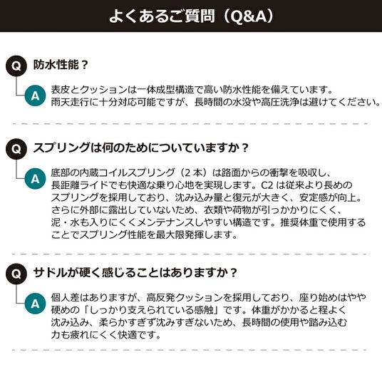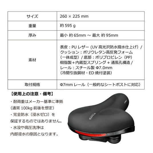 表皮:PUレザー(UV高光沢防水撥水仕上げ)/クッション:ポリウレタン高反発フォーム(一体成型) /底部:ポリプロピレン(PP)樹脂製+内蔵型スプリング+通風孔構造/レール:スチール製 Φ7.0mm(冷間引抜鋼材・ED焼付塗装)