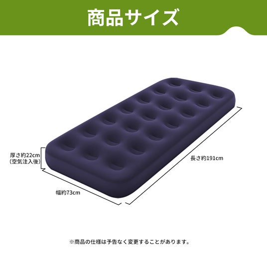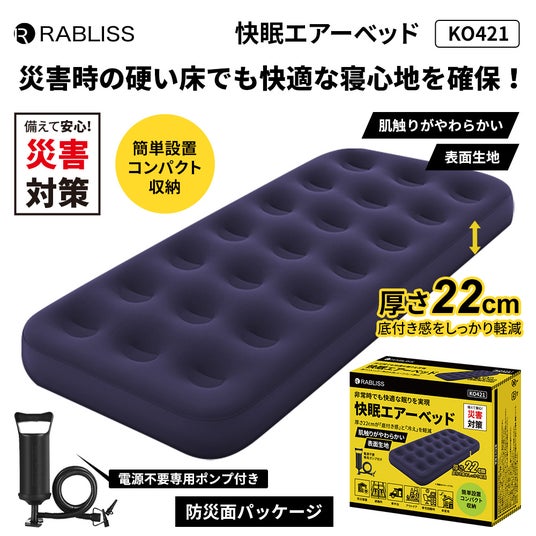 避難所などでの硬い床による底付き感や冷えを22cmという厚さでしっかり軽減し、快適な休息を提供します。1.2kgと軽量ながら、耐荷重はなんと約150kg。大柄な方でもお使いいただけます。空気を抜けばコンパクトに収納が出来るので、いざという時の為の備蓄にも最適です。
