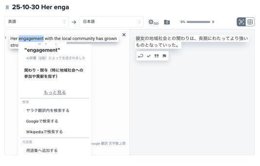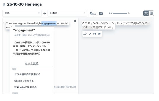 今回搭載されたAI辞書は、LLM(大規模言語モデル)を活用しています。一般的な辞書のように、単語の意味が複数羅列されるのではなく、前後の文意を解析して適切な意味を解説します。また、一般的な単語だけでなく、専門用語や固有名詞にも対応しています。事例「engagement」のケース