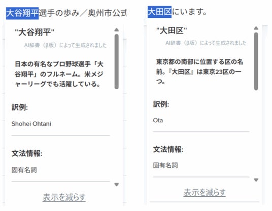 AI辞書は、単語をハイライトするだけで“文脈上の意味”を解説するだけでなく、類義語や対義語、その単語の語源もあわせて表示されます。固有名詞や複合名詞にも対応し、ビジネス文書だけでなく、ニュースメディアなど同音異義語が登場するようなテキストの翻訳効率を大幅にアップすることが期待できます。