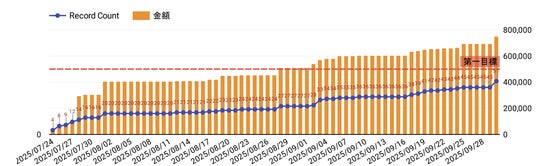 ▼支援募集期間を通じた支援数(折れ線)、及び支援金額(棒線)