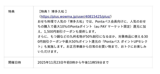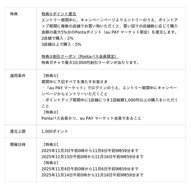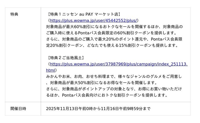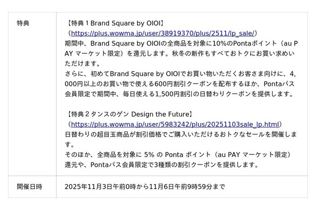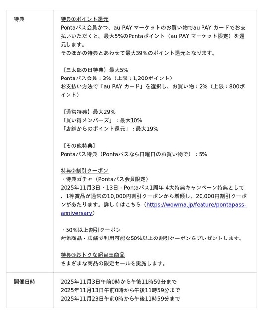 さらに、Pontaパス会員向けに、三太郎の日の特典ガチャの1等賞品が通常の10,000円割引クーポンから20,000円割引クーポンへ増額する特典やPontaパス ポイントUPセレクトなどau PAY マーケットの4大特典がパワーアップする「Pontaパス1周年 4大特典キャンペーン」を2025年11月21日まで開催しています。詳しくはこちら(https://wowma.jp/feature/pontapass-anniversary)