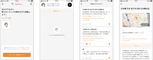 アプリ画面には、トピックを音声で案内した後に、トピックの文面を表示します。また、案内したお店などのホームページへのリンクや地図を表示するため、より詳しい情報を知りたい場合や実際に訪問したい場合はアプリ画面からリンクをたどってもらうことができます。