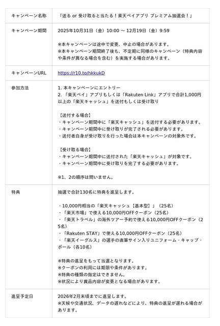 本キャンペーンでは、エントリーのうえ、キャンペーン期間中に「楽天ペイ」アプリもしくは「楽天モバイル」契約者専用アプリ「Rakuten Link」で、合計1,000円以上の「楽天キャッシュ」を送付もしくは受け取った方(注2)の中から、抽選で合計130名に特典を進呈します(注3)。