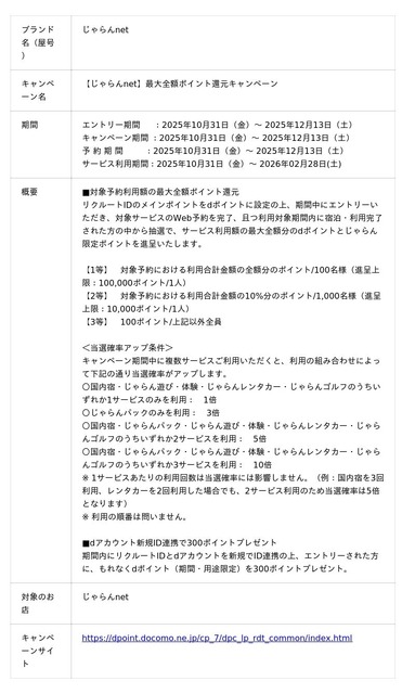 じゃらんレンタカー:dポイント(通常ポイント1%+キャンペーンポイント98%)+じゃらん限定ポイント1%=100%