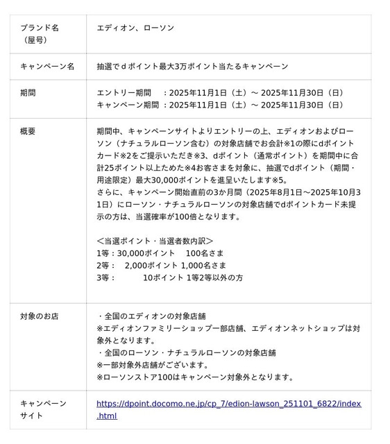 本キャンペーンにはエントリーが必要で、キャンペーン期間中、キャンペーンサイトよりエントリーの上、エディオンおよびローソン(ナチュラルローソン含む)の対象店舗でお会計※1の際にdポイントカード※2をご提示いただき※3、dポイント(通常ポイント)を期間中に累計25ポイント以上ためた※4※お客さまを対象に、抽選でdポイント(期間・用途限定)最大30,000ポイントを進呈いたします※5。