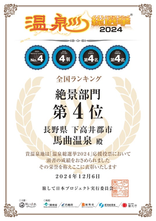 2024年の「温泉総選挙」では絶景部門で全国第4位・中部地方第1位を獲得し、特別賞「クールジャパン賞」を受賞。馬曲温泉は“北信州を代表する絶景の湯”として広く知られる存在となりました。