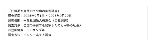 一般社団法人徳志会は、全国の子育てを経験したことがある社会人を対象に妊娠期や産後のうつ病の発症に関するアンケート調査を実施しました。