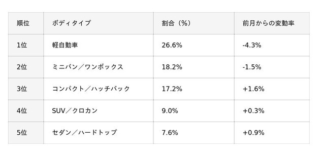 国産車ボディタイプ別買取ランキングは、1位の軽自動車から5位のセダン/ハードトップまで前月と同様の結果となりました。変動率では減少しているように見える1位の軽自動車と2位のミニバン/ワンボックスですが、全体の買取台数は増加しています。また、SUV/クロカンは多くのユーザーが乗り換え時期を迎えていることが、今回の結果にも表れています。