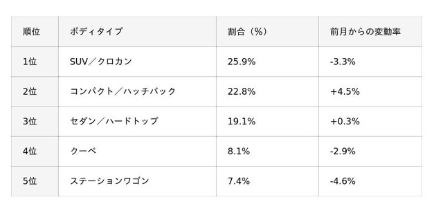 輸入車ボディタイプ別買取ランキングでも、SUV/クロカンが前月に続いて1位になりました。2位にはコンパクト/ハッチバック、3位のセダン/ハードトップが変わらずで、クーペとステーションワゴンが入れ替わり、クーペが4位、ステーションワゴンが5位となっています。こちらも全体の合計台数では、前月よりも増えています。