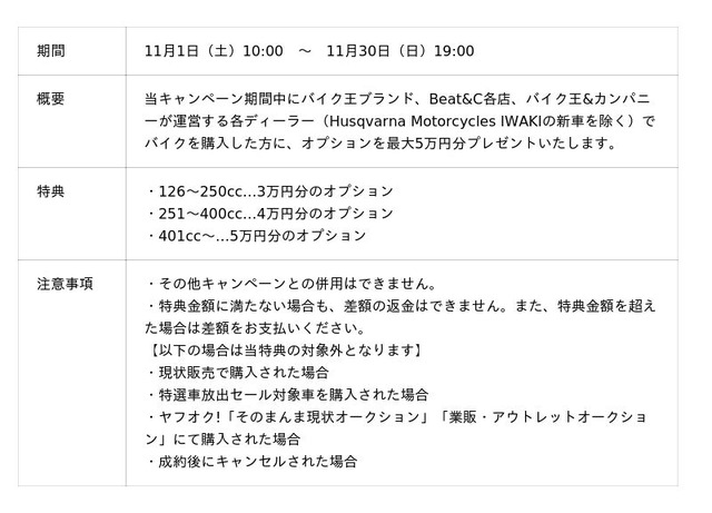 「まだ世界にない、感動をつくる。」をコーポレートミッションに掲げ、ビジョンである「バイクライフの生涯パートナー」の実現に向けて、事業を展開する株式会社バイク王&カンパニー(代表取締役CEO:澤篤史、本社:東京都世田谷区、証券コード:3377、以下「当社」)は、11月末をもって年に一度の決算期を迎えます。日ごろからのご愛顧に感謝して、購入特典に加え、買取の特典もご用意して決算キャンペーンを実施いたします。