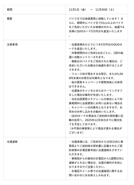 買取サービスでは、期間中に51cc以上のバイクをご売却いただいた方の中から抽選で4名様に5万円分のQUOカードをプレゼントいたします。