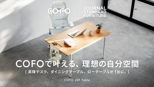 「COFO JSF Table」は、リラクゼーションブランドの『COFO』と独自の世界観でファンを魅了してきた『JOURNAL STANDARD FURNITURE』で共同企画を行った商品で、ワークデスク、ダイニングテーブル、ローテブルを1台に集約した、COFO史上初の4本脚電動昇降デスクです。USBポートを3口搭載し、小物収納に最適な引き出しも内蔵。どうしても「ワーク、作業」のイメージのある昇降デスクを、より日常生活の中に溶け込ませるデザイン性、機能性に仕上がっています。