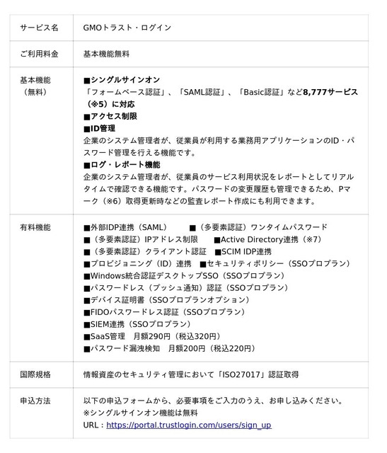・特典内容:「GMOトラスト・ログイン」の「SSOプロ+SaaS管理」1年間無料