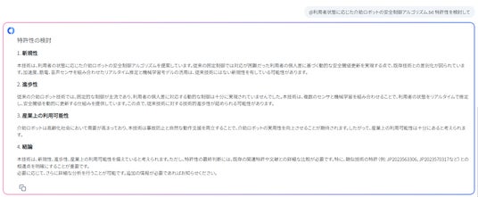 「MyTokkyo.Ai」は、研究メモやログデータ、試験レポートなどを解析し、AIが発明の本質を抽出する機能を有する。本件では、加速度・筋電・音声センサから得た時系列データを入力し、AIが「状態推定モデル」「安全閾値更新機構」「緊急停止条件」の3つの要素を自動特定。先行特許との差分(閾値の個人適応更新処理)を明確化し、発明提案書から出願ドラフトまでの工程を大幅に短縮した。