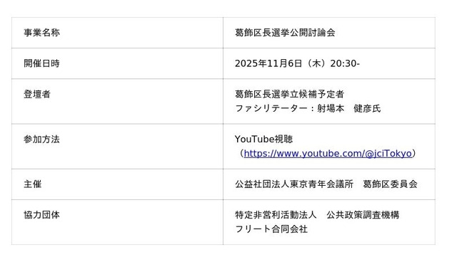公益社団法人東京青年会議所 葛飾区委員会は、2025年11月6日(木)葛飾区長選挙に向けた「ネット公開討論会」を開催します(同日20:30開始予定/YouTube配信)。
